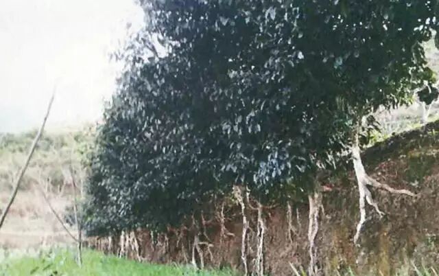 ▲ 三家村田坎邊的古茶樹,根部裸露,長得奇特。